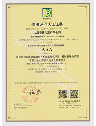 大慶華營化工有限公司成立于2006年7月10日,注冊資金3300萬元,公司類型為有限責任公司。位于大慶高新技術產業開發區宏偉園區,是一家集油田助劑產品的研發、生產、銷售和技術服務為一體的現代化高新技術企業。公司注重科技創新,公司擁有18項自主知識產權。企業承擔過國家火炬計劃重點項目、國家科技型中小企業創新項目等,2011年被科技部火炬高新技術產業開發中心評為國家火炬計劃重點高新技術企業。公司十余種產品獲得中國石油天然氣集團公司產品質量認可證書,其中粘穩型驅油劑獲國家火炬計劃重點項目證書。公司憑借多年對大慶油田及周邊油田地質情況的研究,可針對各油田地層特點調整產品的配方,更好地發揮各類油田助劑的性能。